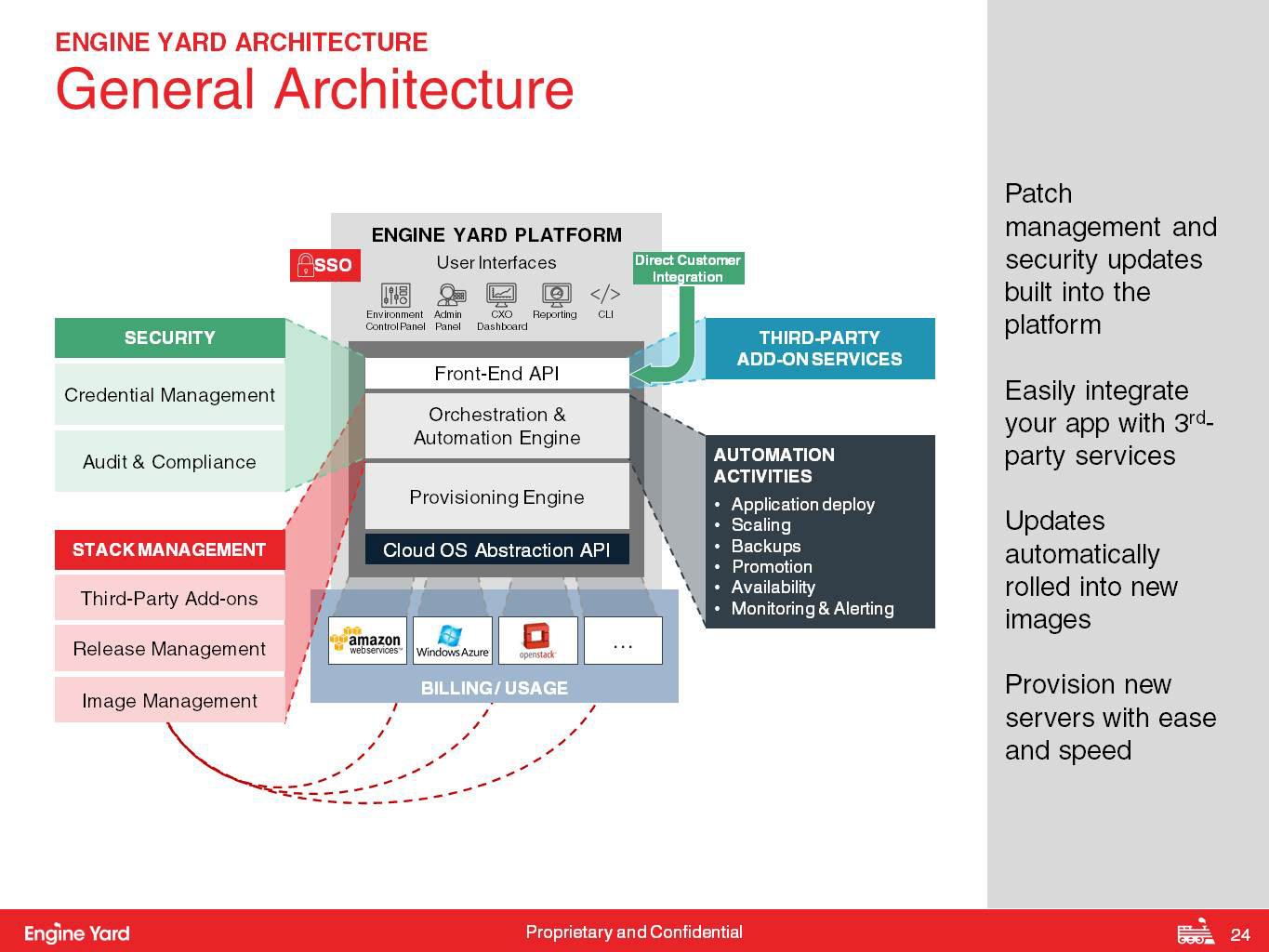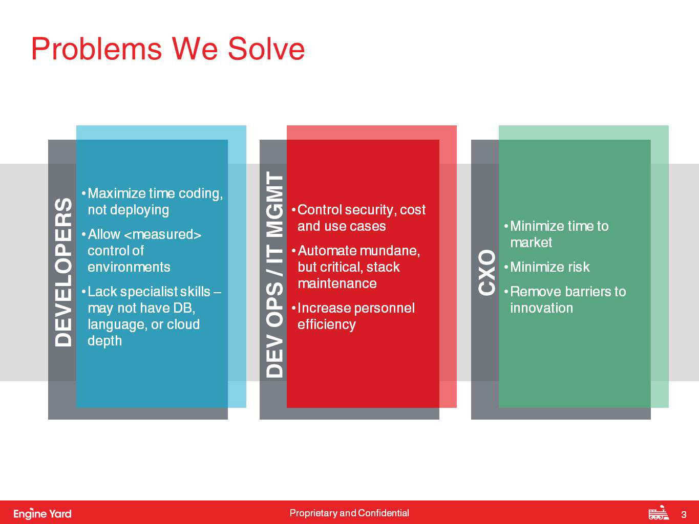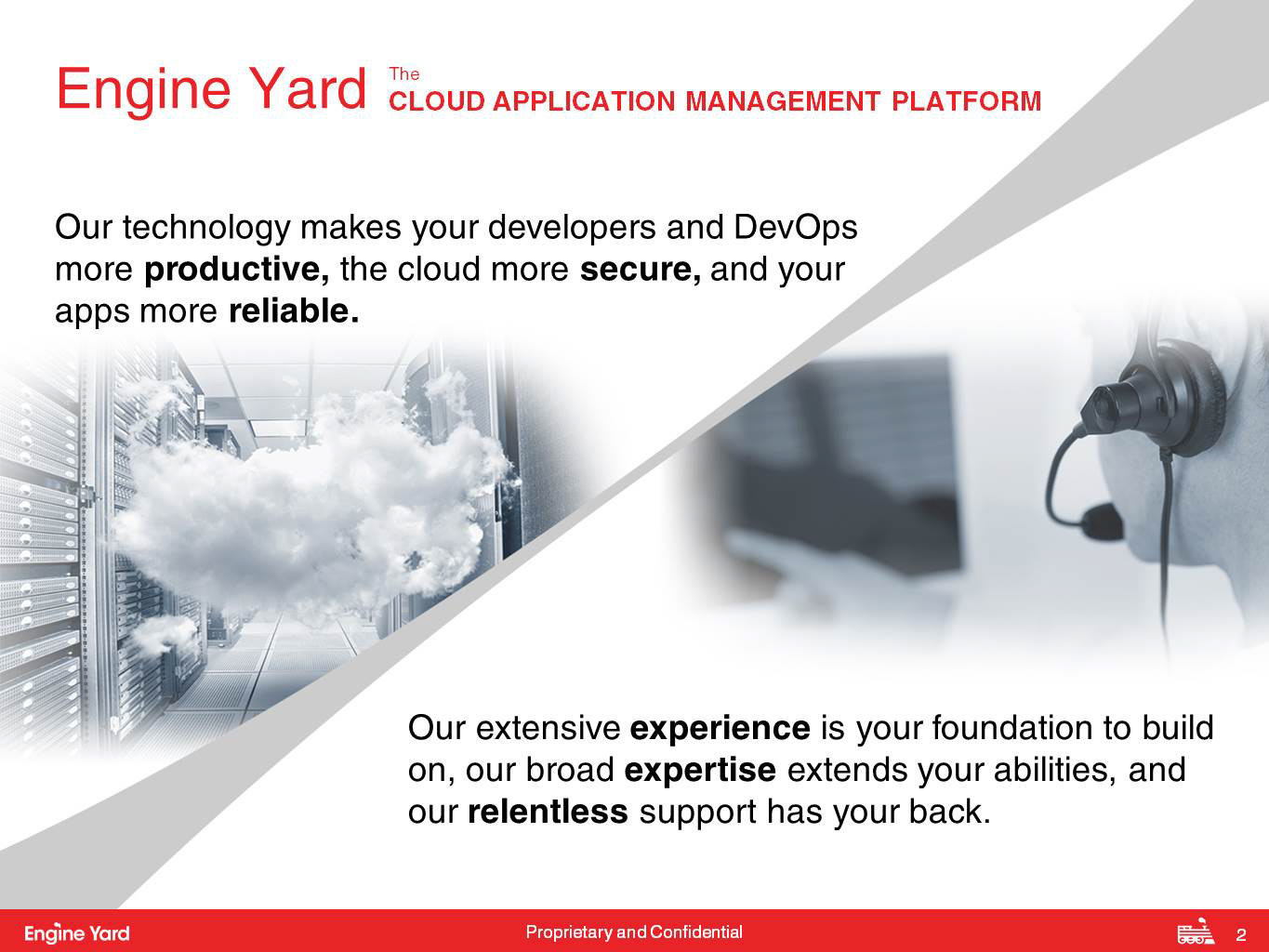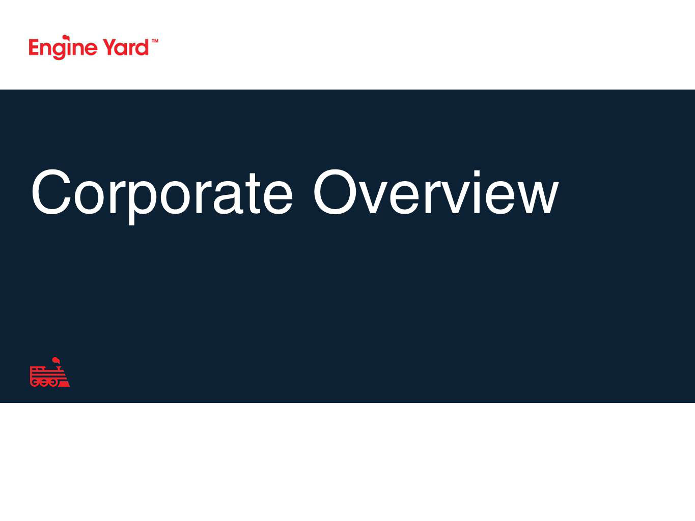 Engine Yard is a startup in the PaaS (Platform-as-a-Service) arena that recently completed their identity system. In conjunction with their new look and feel, they needed a presentation template and Corporate Overview presentation that would let viewers know what they were all about while firmly establishing their newly-adopted visual identity. The Engine Yard look and feel is clean, crisp and on trend, using a bright primary color palette. They already had an icon library, but other than that there weren't many graphic examples within the new system. I set up the PowerPoint template for them with several layout options, defining fonts, color choices, and graphic treatments. The first presentation to use the template is the Corporate Overview shown here; I used it to help further define how colors and shapes are used within the identity system to define information hierarchies and clearly communicate concepts to the viewer.