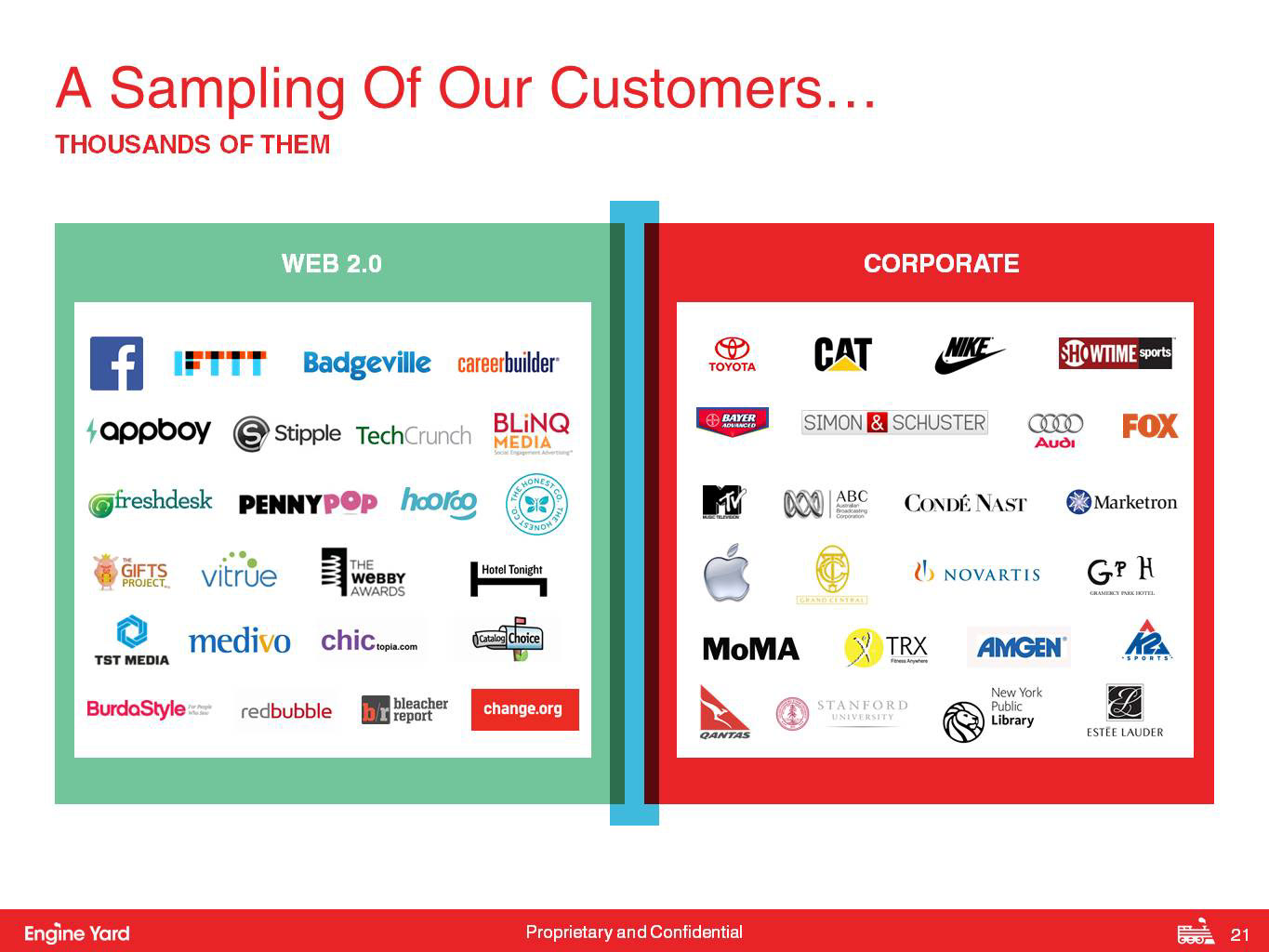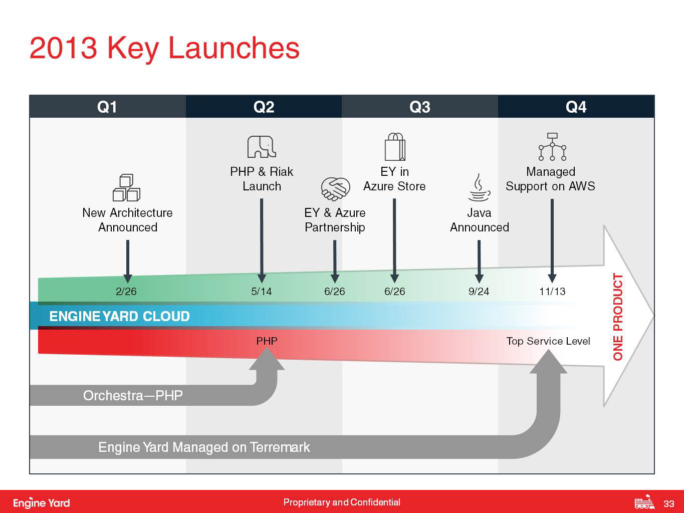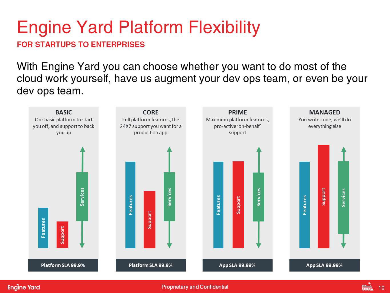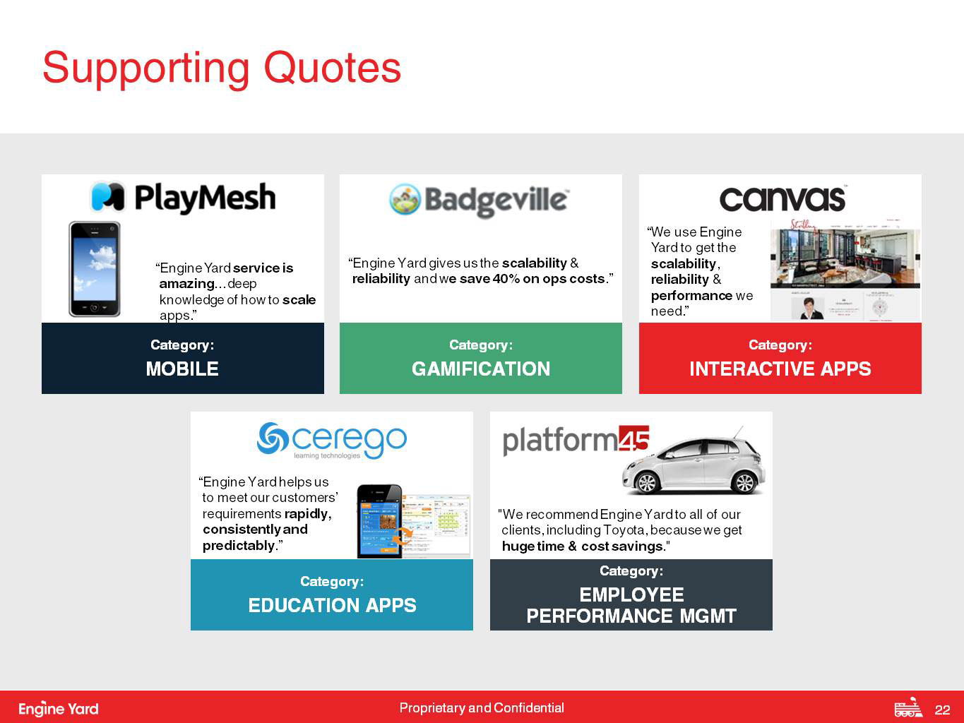 Engine Yard is a startup in the PaaS (Platform-as-a-Service) arena that recently completed their identity system. In conjunction with their new look and feel, they needed a presentation template and Corporate Overview presentation that would let viewers know what they were all about while firmly establishing their newly-adopted visual identity. The Engine Yard look and feel is clean, crisp and on trend, using a bright primary color palette. They already had an icon library, but other than that there weren't many graphic examples within the new system. I set up the PowerPoint template for them with several layout options, defining fonts, color choices, and graphic treatments. The first presentation to use the template is the Corporate Overview shown here; I used it to help further define how colors and shapes are used within the identity system to define information hierarchies and clearly communicate concepts to the viewer.